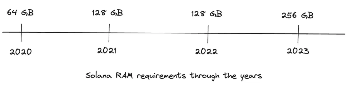 相对频繁地增加基线节点要求。这大致就是 Solana 和 Sui 等集成高性能区块链所采取的路径。节点的高基线使它们能够构建非常快速的区块链,并且还消除了应用程序设计中的一些设计限制。Phoenix 是 Solana 上的限价订单簿 DEX,目前无法在以太坊(或任何 L2)上构建。不断增加的基线要求的另一面是,如果它们不断增长,那么运行节点可能只对专业基础设施提供商可行。历史 RAM 需求很好地展示了 Solana 上的硬件需求如何持续增长: