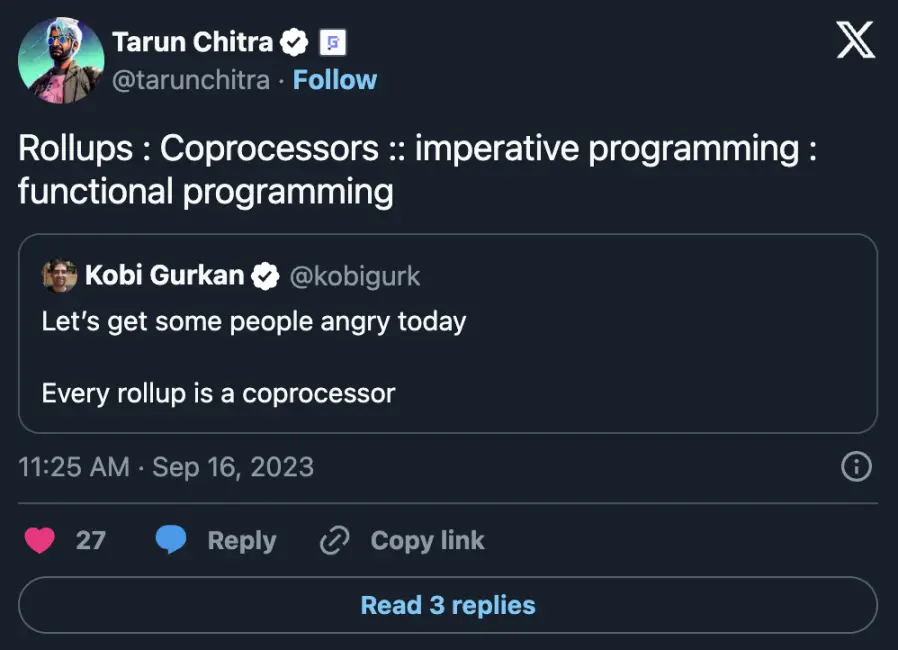 一个有趣的类比将 rollup 和协处理器之间的相互作用与命令式编程和函数式编程进行了比较。命令式编程侧重于可变状态和副作用,指定逐步执行任务的方式。函数式编程强调不可变数据和纯函数,避免状态变化和副作用。同样,rollup 就像修改它们所持有的状态的命令式程序,而协处理器就像函数式程序,它们不会改变状态,但会生成结果以及计算证明。此外,就像命令式编程和函数编程一样,rollup 和协处理器也有其用武之地,并且应该相应地使用。