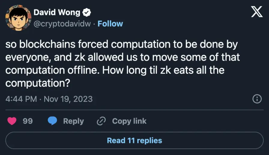 最终,以太坊的目标是让用户能够访问无需信任的计算和存储。过去,在以太坊上访问免信任计算的唯一方法是由所有节点执行和验证计算。随着证明技术(尤其是零知识证明)的进步,我们可以将验证器节点上发生的大部分计算转移到链外计算,而只让验证器在链上验证结果。这本质上将以太坊变成了世界上不可变的公告板。计算证明使我们能够验证交易是否正确完成,并且通过将它们发布到以太坊,我们可以获得这些证明的时间戳和不可变的历史存储。随着零知识证明在任意计算上变得更加高效,在某些时候,在 ZK 中进行计算的成本可能会大大低于在区块链(甚至可能是 100 个验证者的 CometBFT 链)上进行计算的成本。在这样的世界中,很难想象 ZK 证明不会成为访问去信任计算的主导模式。David Wong 最近也表达了类似的想法:
