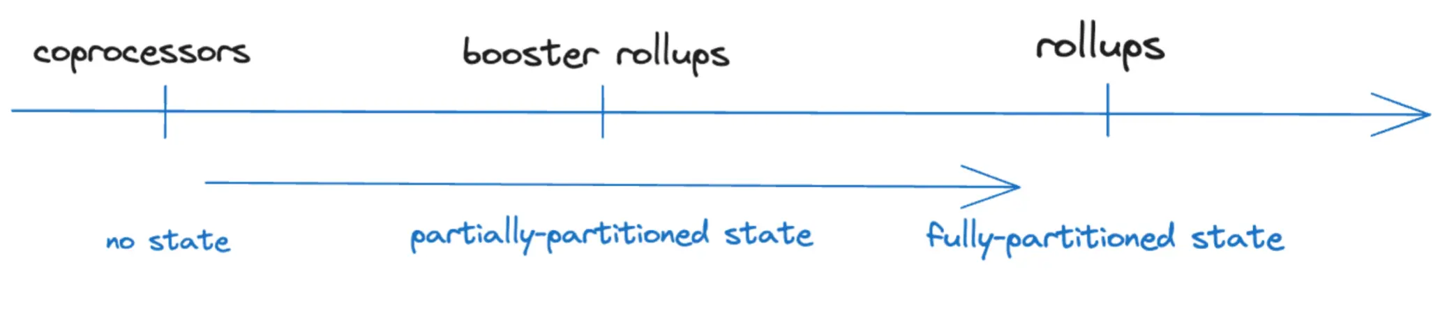 最近,Booster Rollups 被提出,它执行交易就像直接在主机链上运行一样,可以访问主机的完整状态。然而,Booster Rollups 也有自己的存储,允许它们跨主机和 Rollup 扩展计算和存储。Booster Rollup 提案指出了链外计算设计范围中存在一个频谱,传统的 Rollup 和协处理器位于该频谱的两端。Rollups、Booster Rollups 和 Coprocessors 都提供对更多计算的访问,唯一的区别在于它们保留了从基础 L1 分区的状态量。