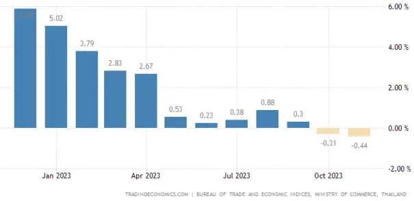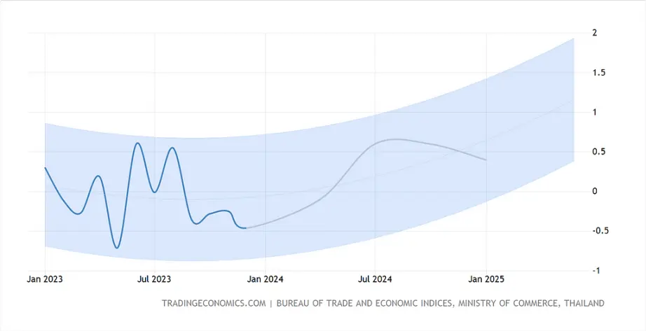 根据 Trading Economics 全球宏观模型和分析师的预期,到本季度末,泰国的通胀率环比预计为 -0.10%,从长远来看,泰国通胀率预计在 2024 年为 0.40% 左右,到 2025 年为 0.30% 左右。也就是说,如果政府没有强力措施进行改变,泰国的货币价值下降、经济持续萎缩以及由此导致的贫富差距加大,将会在 2024 年延续。