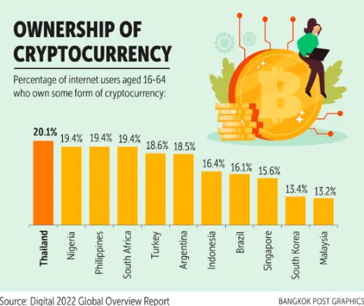 泰国在平民采用方面表现良好, 在 Chainaanalysis 的「2023 年全球加密货币采用指数」中名列第 10,根据《2022 年全球数字概览报告》,泰国是全球在互联网用户中拥有加密货币比例最高的国家之一,